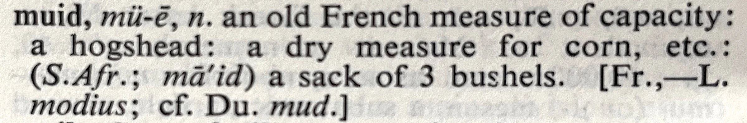 muid, noun: an old French measure for capacity; a hogshead, a dry measure for corn etc. South Africa: a sack of three bushels.