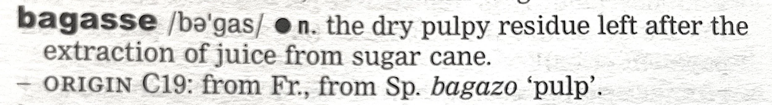 bagasse, noun: the dry pulpy residue left after the extraction of juice from sugar cane.