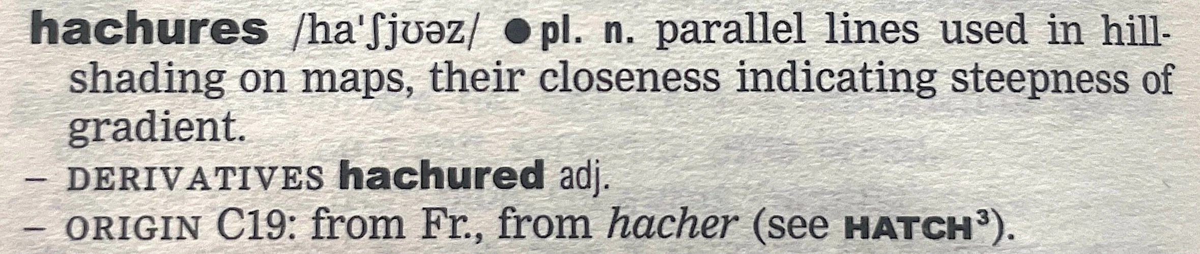 the dictionary entry for Hachures,  plural noun: parallel lines used in hill shading on maps, their closeness indicating steepness of gradient.