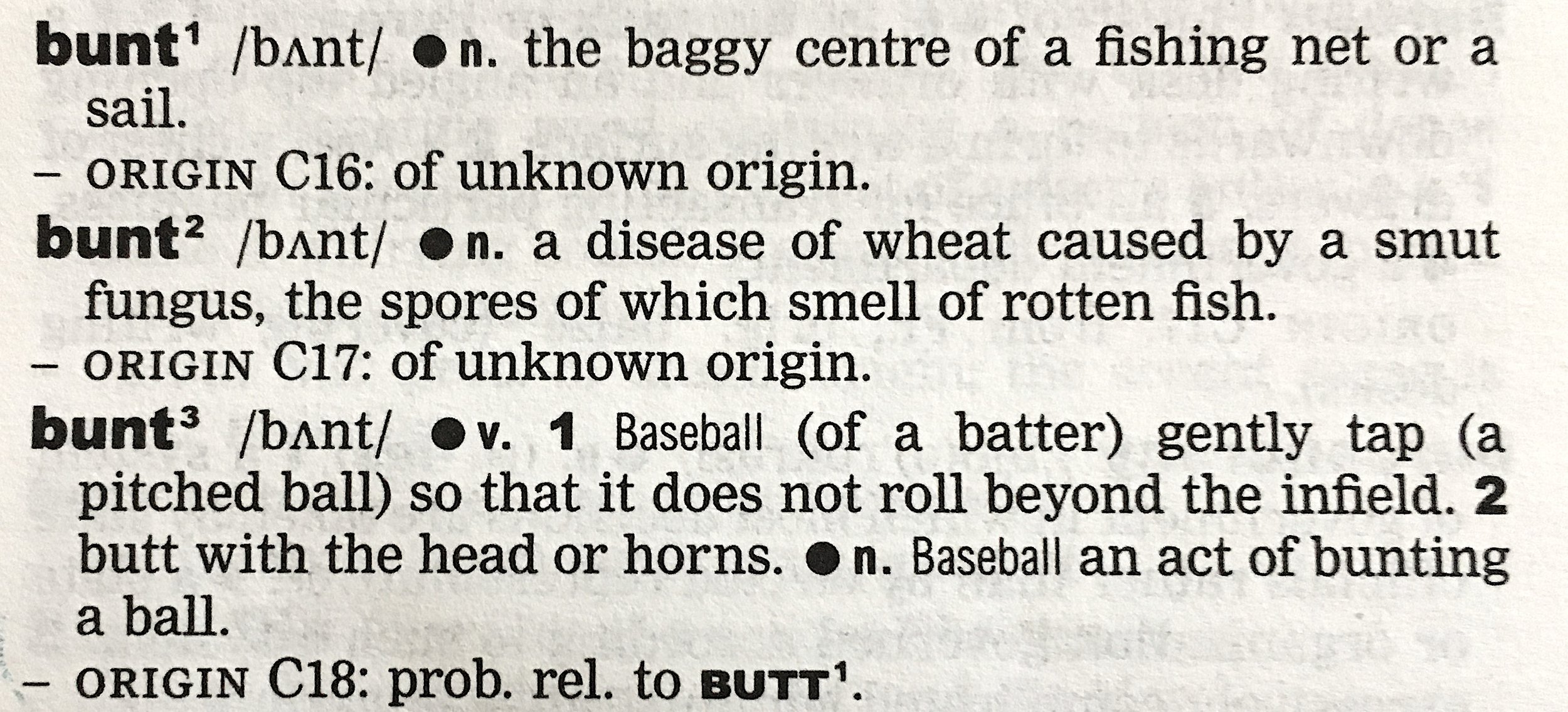 3. verb, 1: baseball (of a batter) gently tap (a pitched ball) so that it does not roll beyond the infield. 2. Butt with the head or horns. Noun, baseball: an act of bunting a ball.