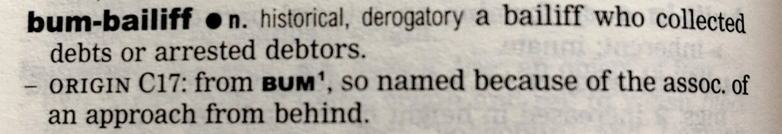 bum-bailiff, noun, historical, derogatory: a bailiff who collected debts or arrested debtors. Origin 17th century from bum, so named because of the association of an approach from behind.