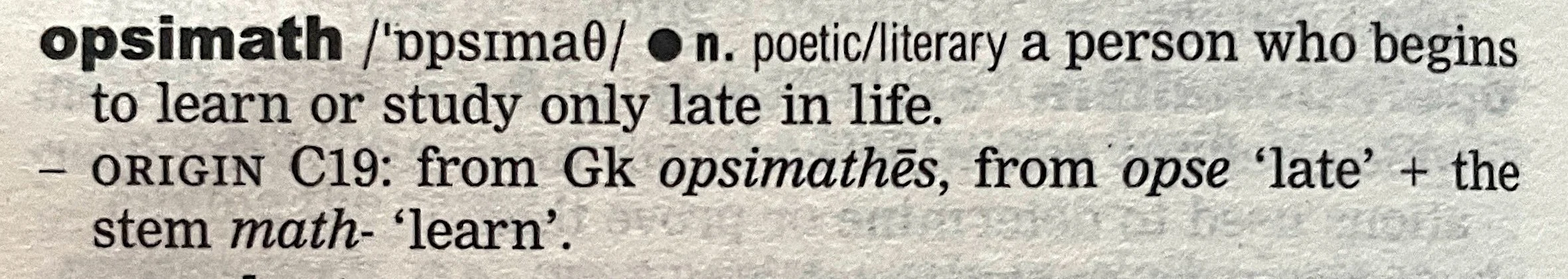 Origin 19th century: from Greek opsimathes, from opse 'late' + the stem math- 'learn'.